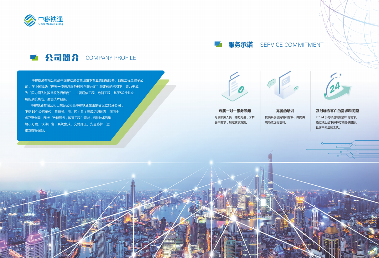 ◆中移铁通有限公司是中国移动通信集团旗下专业从事数智服务、数智工程全资子公司,在中国移动“世界一流信息服务科技创新公司”新定位的指引下,致力于成为“国内领先的数智服务提供商”。主营通信工程、数智工程,基于5G 行业应用的系统集成、通信技术服务。中移铁通有限公司山东分公司是中移铁通在山东省设立的分公司,下辖17 个经营单位,具备省、市、区(县)三级组织体系,面向全省乃至全国,围绕“数智服务,数智工程”领域,提供技术咨询、解决方案,软件开发、系统集成、交付施工、安全防护、运维支撑等服务。