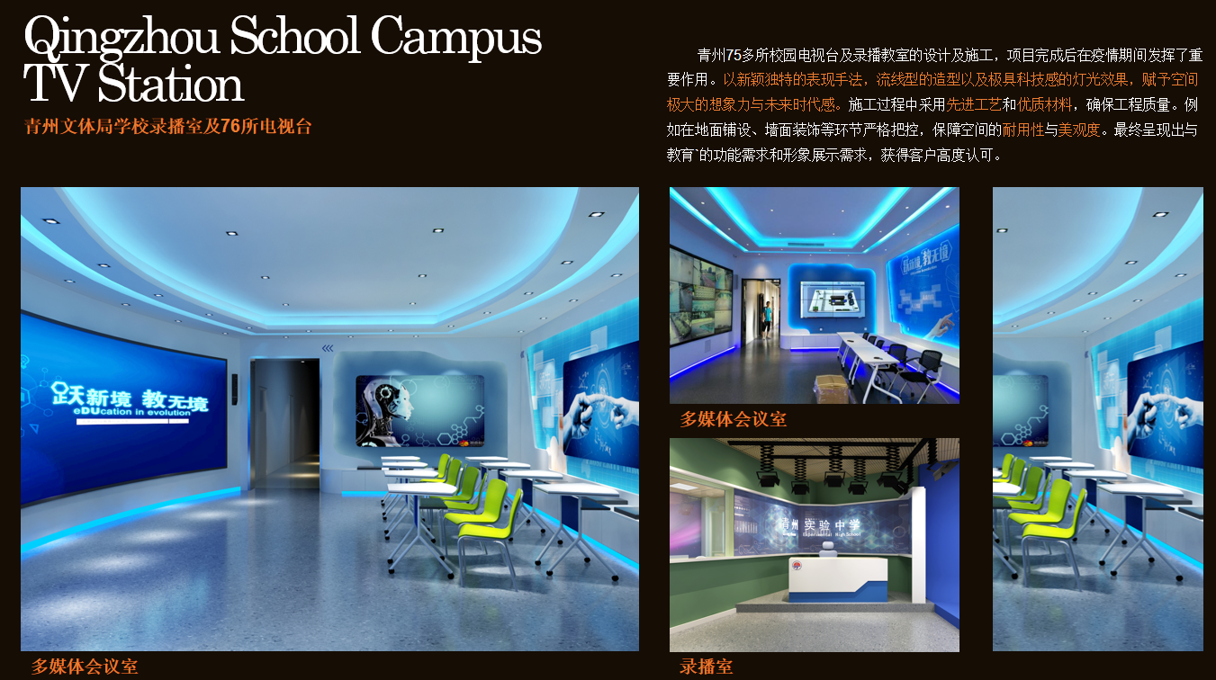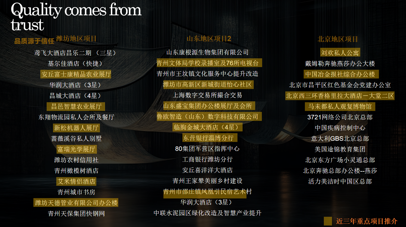 ·山东区域:临朐金城大酒店(四星)、昌城大酒店(四星)、青州凤凰引民宿艺术村、青州 76 所校园电视台 / 录播室、新松机器人展厅、富士康农业展厅、鲁欧智造办公楼、潍坊高新区怡心社区改造等。
